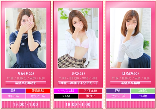 人気嬢は「さやか」(162 B.85(D) W.61 H.90)と「ひとみ」(153 B.87(D) W.63 H.86)嬢。